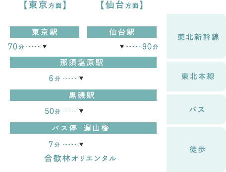 東北新幹線 『那須塩原駅』を下車後、東北本線・黒磯方面に乗り換え、終点『黒磯駅』で降ります。『那須ハイランドパーク行き』のバスに乗り、『遅山橋』バス停留所を下車、交差点を黒磯方向に200m下って頂きますと、右手に宿がございます。